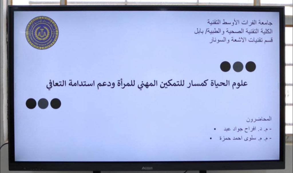 برعاية عميد الكلية التقنية الصحية والطبية – بابل الأستاذ المساعد الدكتور رعد عجم الجوراني، نظّم قسم تقنيات الأشعة والسونار وبالتعاون مع وحدة شؤون المرأة ندوة علمية بعنوان «علوم الحياة كمسار للتمكين المهني للمرأة ودعم استدامة التعافي»، وذلك ضمن برنامج الكلية الهادف إلى دعم قضايا المرأة وتعزيز دورها العلمي والمهني في مؤسسات التعليم العالي والمجتمع.